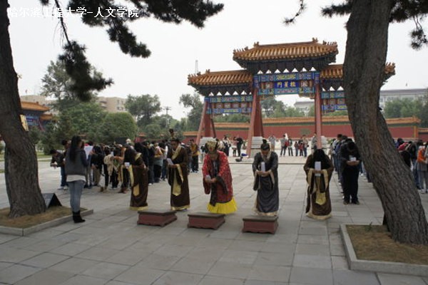 “祭祀就位。”伴随着《咸和之曲》,在主持人王语琦的指令声中,主祭官张明哲神情肃穆地走到孔子挂像前焚香礼拜并诵祭文。随后,全体师生向大成至圣先师孔子行五鞠躬礼并齐诵《大学.第一章》、《礼记.礼运大同篇》等国学经典。在来自哈工程Dream Catcher舞社的12名身着汉服的学生献上古典舞后,释奠礼礼成。