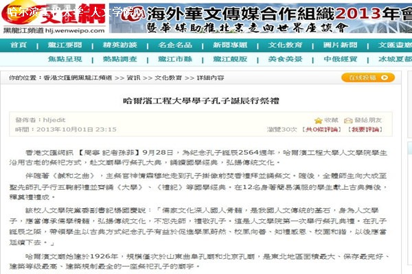 2013年10月1日,香港文汇报文化教育”版块发布新闻对pp电子游戏官网学生赴孔庙行祭礼仪活动进行了全面介绍。