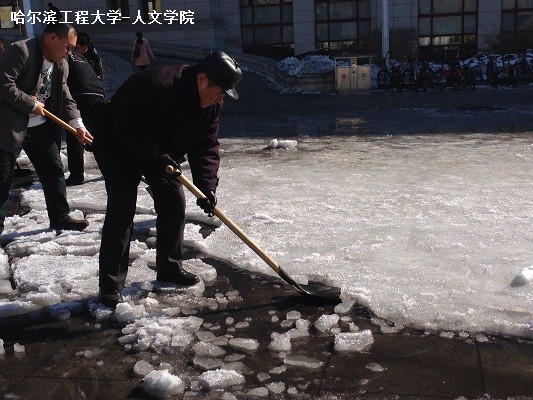 活动开始前,杨国庆发表简短讲话,指出本次活动对于彰显人文精神、发扬奉献美德的重要意义。同时鼓舞师生们卯足干劲地投入清扫积雪的活动中。经过简单分工后,全体人员就有条不紊地忙碌起来。男生负责铲冰以及运送大块冰雪,女生主要负责清理冰屑与雪堆,而老师们在一旁进行指挥分工后也加入铲雪的队伍中。