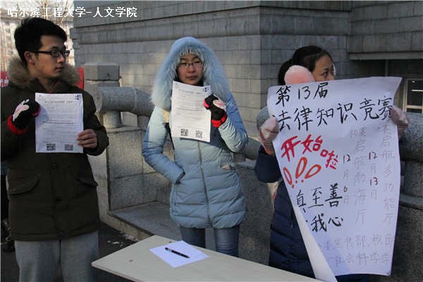 本次活动旨在宣传即将举办的第十三届法律知识竞赛,号召学生踊跃参加比赛。通过介绍赛制、发放传单等方式使有兴趣的学生了解该竞赛的大体流程及事前准备事宜,从而为本次竞赛的顺利举办奠定基础。