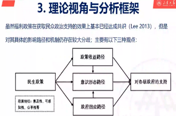 政治信任是现代社会理解公民和政府关系的核心概念,是联系个体公民与治理机构,乃至整个政治体制的纽带。李忠路教授从概念界定、政治信任的测量、转型期政治信任特征、制度路径解释、文化传统解释五个维度简述了政治信任。而政治信任——尤其是处于不同社会阶层群体的社会信任路径——与民生政策之间的关系看似是必然的,但深入下去的时候又仿佛是水中月影,不易把握。尤其是在习近平总书记明确指出“保障和改善民生没有重点,只有连续不断的新起点”的背景下,虽近年来我国政府不断加强对于民生政策的倾斜力度,但更多只侧重了相关政策的经济收益,而对其政治收益未能透彻分析。其中很大一部分原因在于学界尚未对民生政策与政治信任之间的关系链条分析清楚。李忠路教授的本次讲座的主旨就是对该问题进行一次实证性探讨。