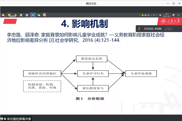 接着李忠路教授分享了量化研究破解经验,介绍了量化研究如何在“群体差异”、“效应差异”、“社会选择”、“影响机制”四个层面上破题;并分别用具体的四篇经验研究论文为例做了具体介绍。