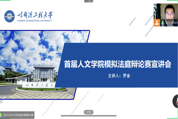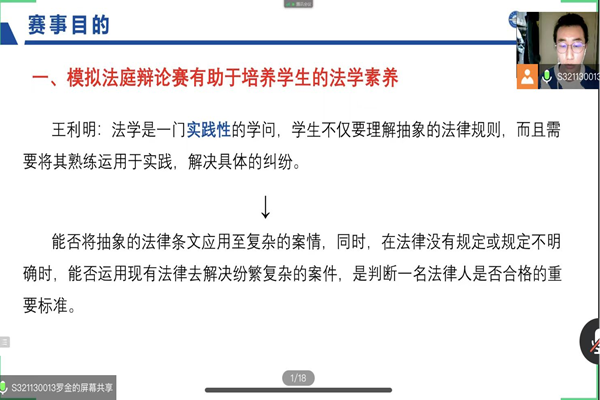 (宣传中心记者团记者 赵丰、董昕瑶报道)2022年3月4日晚20时30分,首届pp电子游戏官网pp电子游戏官网模拟法庭辩论赛宣讲会于腾讯会议召开。pp电子游戏官网党委副书记曹景杰,法学系党支部书记刘沫茹老师,2020级班主任王盈老师、张明明老师,法学系陈晓雷老师,上届“理律杯”学生领队吴红迪、罗金及参赛队员,本次赛事的四位领队李隽姝、田文怡、吴欣怡、曹伊童,以及2020、2021级部分法学专业本科生参加会议。法学专业研一学生罗金担任主讲人。