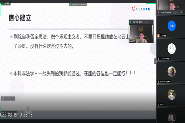 (pp电子游戏官网 李佳蓬报道)2022年3月19日,pp电子游戏官网法学系教工党支部和2021级研法学团支部联合举办法考经验分享会。依托腾讯平台,pp电子游戏官网党委副书记曹景杰、法学教工党支部书记刘沫茹以及80余位本科生和研究生参加了线上会议。