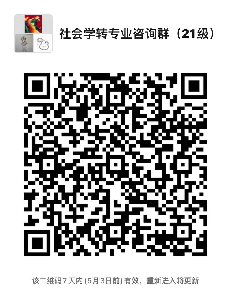 pp电子游戏官网2021级本科生转专业工作咨询会将于5月4日下午3:00微信群内进行,届时社会学、法学专业负责老师将为前来咨询的同学,对两个专业进行介绍和专业知识解答。若对社会学和法学感兴趣,有意向转专业的同学,进入学院建立的微信群(扫码进群),我们期待更多优秀的你们加入我们的大家庭!