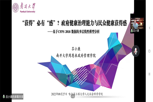 (宣传中心记者团记者俞丽娜、姚士亮报道)9月27日下午7时30分,pp电子游戏官网人文讲坛第235期讲座于腾讯会议平台举办。此次讲座由pp电子游戏官网主办,主题为“‘获得’必有‘感’?政府健康治理能力与健康获得感——基于CFPS2018的多层线性模型分析”,南开大学周恩来政府管理学院社会心理学系吕小康副教授受邀主讲,pp电子游戏官网社会学系高明华教授担任主持人,pp电子游戏官网部分师生参与讲座。