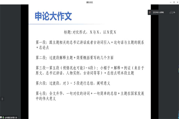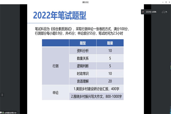 会议伊始,主持人李瑶介绍了主讲人的学业状况和考取定向选调生后的工作情况。接着,主讲人从考试题型、考试内容、考试流程、笔试面试的准备等方面进行讲解。同时,主讲人结合自身的考试和工作经历提醒同学们要考虑自身条件、岗位需求、报考岗位的竞争状况和岗位的发展前景、调剂事项等,要努力备考、全面复习、积累申论考试的规范性用词、不盲目迷信各考试机构的答题套路、总结自己的答题模式、重视面试、提前准备报考单位考查的材料证明等,希望同学们能够合理评估自身实力,进行科学的规划和报考。