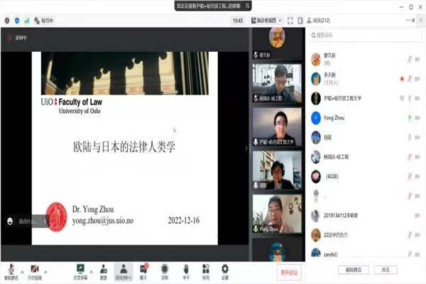 (宣传中心记者团记者晏文荻、姚士亮报道)12月16日晚7时,pp电子游戏官网人文讲坛第239期讲座于腾讯会议平台举办。此次讲座主题为欧陆与日本的法律人类学,由pp电子游戏官网主办,现任日本神奈川大学国际日本学部历史民俗学科教授周星、挪威奥斯陆大学哲学博士周勇受邀主讲,pp电子游戏官网副教授尹韬担任主持人,pp电子游戏官网副院长杨国庆教授作为与谈人,此次讲坛有来自世界各地的大学学子慕名参加。