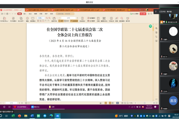 会上,大家共同学习《认真学习宣传贯彻党的二十大精神团结带领广大同学坚定跟党走、奋进新征程——全国学联第二十七届委员会第二次全体会议在京召开》《关于认真学习宣传贯彻党的二十大精神团结带领广大同学坚定跟党走、奋进新征程的决议》《在全国学联第二十七届委员会第二次全体会议上的工作报告》《中华全国学生联合会委员会、主席团工作规则(试行)》等文件,并结合自身工作实际进行交流发言。