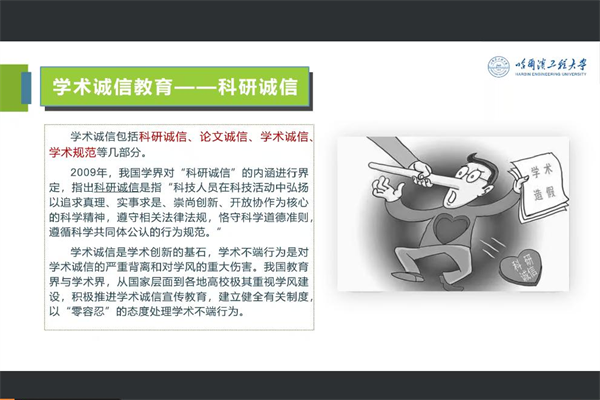 侯博文首先阐述了学术诚信的定义及其重要性,并逐一介绍学术不端的类型和关于学术诚信相关的法律法规和校规校纪,最后通过部分学术不端典型案例再次强调学术诚信的重要性。侯博文希望同学们恪守学术道德,践行学术诚信,做学术成果的创造者、崇高学术品格的践行者。