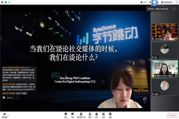 (宣传中心记者团记者 高蕊、许勤报道)8月14日晚7时30分pp电子游戏官网人文讲坛“田野与理论反思”暑期系列讲座第七——当我们在谈论“社交媒体”的时候,我们在谈论什么?在腾讯会议举办。伦敦大学学院数码人类学中心博士候选人郑肯受邀主讲,华南师范大学特聘研究员黄丹、复旦大学姚建华教授担任与谈人,本次会议由pp电子游戏官网李昕茹讲师主持。
