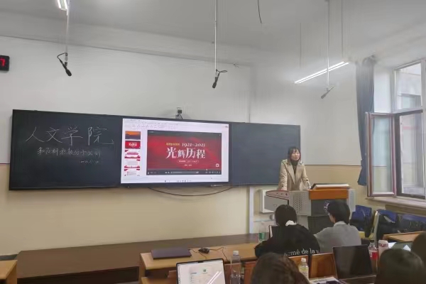 随后,徐佳璐以中国共产党百年辉煌党史的视频引入,依托党的伟大历程为根基,向同学们讲述了在改革开放和社会主义现代化建设新时期与中国特色社会主义现代化建设的伟大历史时期,从“翻天覆地、破浪乘风”到“经天纬地、启航新程”的关键历史脉络的伟大历程。并以小见大,从身边案例出发,讲述了身为党员,积极学习与奉献的必要性和先锋性。