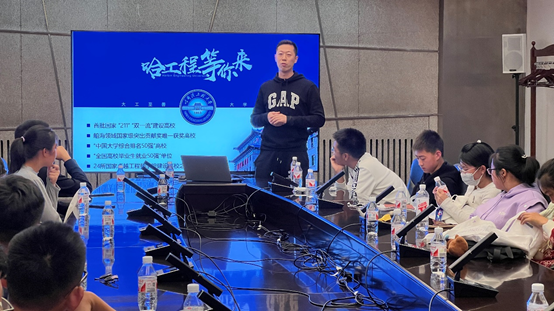 在工程文化展厅,工程训练中心教师周莹和李泽辉带领同学们认识哈工程、走进哈工程。通过为同学们介绍我国的大国重器,讲述一代代科技工作者刻苦钻研的故事,激发了同学们的创新热情。