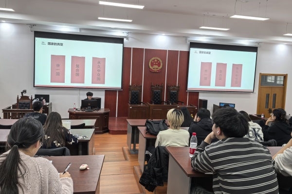 随后,她结合自身国际法专业方向实践,就国际法与国际关系、国际政治等进行讲授。国际法与国际政治同样有着紧密的关系。她阐述了国际公法的基本原则和发展趋势,并结合习近平法治思想,讲解了中国在国际法治建设中的积极贡献和实践案例。她强调,习近平法治思想不仅在国内法治建设中具有指导意义,在国际法治领域也展现出独特的中国智慧和中国方案。我们应当大力推进习近平法治思想与涉外法治建设。她还特别提到了国际法在解决国际争端中的应用,以及如何通过国际法律框架来维护国家利益和促进全球治理。她鼓励学生们不仅要深入学习国际法的理论知识,还要关注国际法在实际操作中的运用。