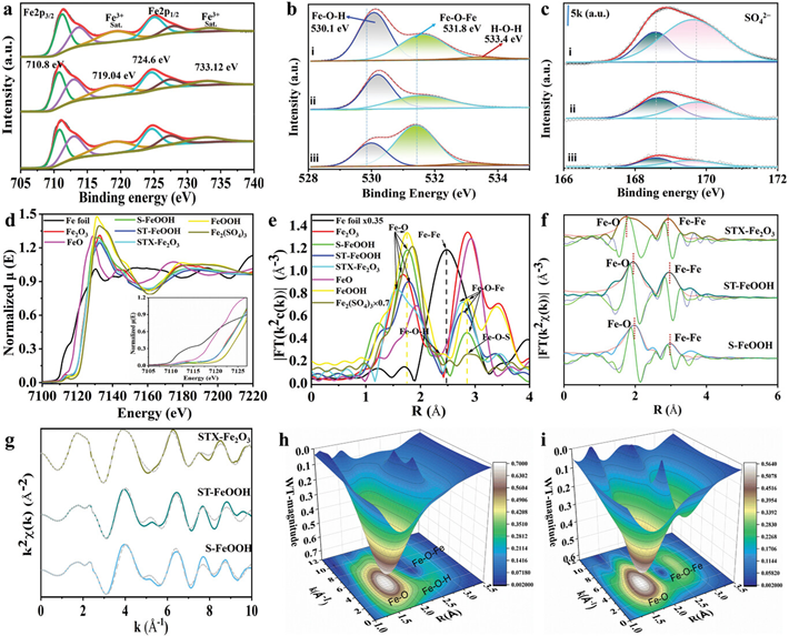 图2 (a-c) S-FeOOH、ST-FeOOH和硫酸盐织构转变的Fe2O3 (Sulfate-textured transformed Fe2O3, STX-Fe2O3)的Fe 2p、O 1s和S 2p高分辨率XPS谱。(d-e) Fe K边X射线吸收近边结构分析。(f-g) 小波变换扩展XAFS分析。(h-i) 多尺度结构表征。