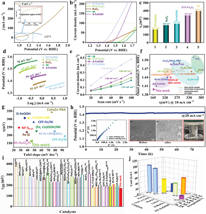 图4 (a) ST-FeOOH的线性扫描伏安曲线。(b) CV活化后的线性扫描伏安曲线。(c) 达到10 mA cm−2时所需的过电位。(d) S-FeOOH,ST-FeOOH,STX-Fe2O3,RuO2和铁 (Iron mesh, IM)催化剂的塔菲尔斜率与 (e)电流密度/扫描速率的关联性。(f-g) 各种催化剂的过电位、起始电位和塔菲尔斜率的关系。(h) OER催化耐久性测试。(i) ST-FeOOH与先进非贵金属OER电催化剂的性能对比。(j) 成本-性能对比图。
