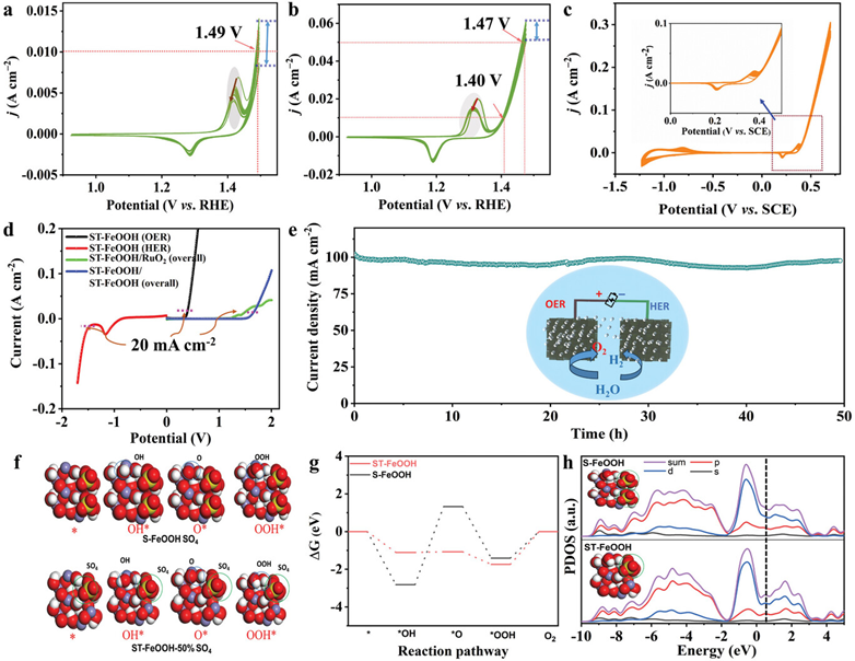 图5 (a-b) S-FeOOH与ST-FeOOH电极在1 M KOH溶液中的OER循环伏安曲线。(c) ST-FeOOH电极的循环稳定性。(d) ST-FeOOH电极用于OER、析氢反应和整体水分解的线性扫描伏安曲线。(e) 恒电流循环稳定性测试。(f) OER过程中S-FeOOH和ST-FeOOH的结构及其相应的中间体。(g) OER中间体的吉布斯自由能和 (h) S-FeOOH和ST-FeOOH的态密度。
