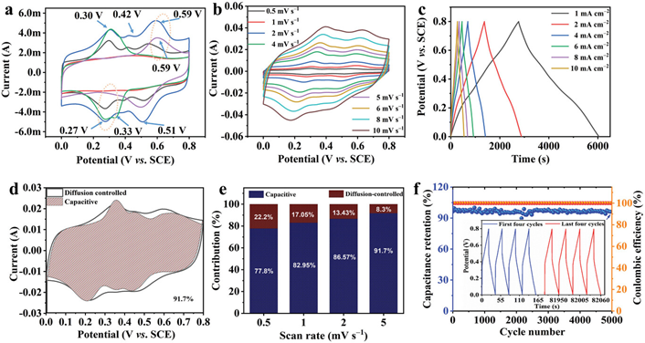 图3 (a) 不同电解液体系下ACC,ST-FeOOH和S-FeOOH的CV曲线对比。(b) ST-FeOOH电极在不同扫速下的CV曲线,(c) GCD曲线,(d) 在1 A g−1下的电容与扩散控制贡献和 (e)归一化电容与扩散控制贡献随扫描速率变化规律。(f) ST-FeOOH电极的循环稳定性。