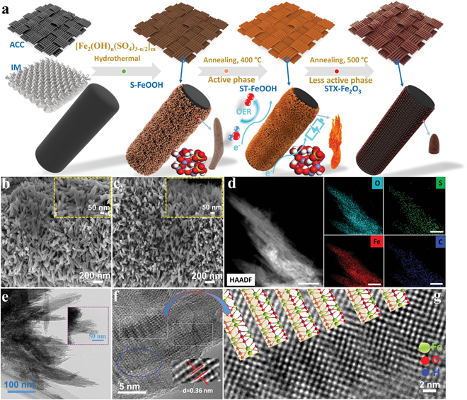 设计构筑具有优异储能性能和高效OER的非贵金属基电极,是可再生能源领域的重大挑战之一。为此,本文提出了一种稳定高效、低成本的构筑方法,通过引入并调控本征硫酸根离子 (SO42−)来提升FeOOH纳米棒的储能性能和OER催化活性。具体地,通过对聚合硫酸铁采用一步水热合成了硫酸化的羟基氧化铁 (Sulfated FeOOH, S-FeOOH)纳米棒。值得注意的是,即使在高温下,SO42−的存在也可以有效抑制FeOOH转变为活性较低的Fe2O3。在退火过程中,SO42−逐渐浸出,从而引发材料的重构,导致铁氧 (Fe-O)键的长度缩短,从而形成了具有“硫酸盐织构”的FeOOH (Sulfate-textured FeOOH, ST-FeOOH)纳米棒。这种结构变化产生了更多的活性位点,增大了材料的比表面积。重要的是,与已报道的非贵金属催化剂相比,由ST-FeOOH纳米棒制造的电极表现出显著提升的储能性能 (3684 mF cm−2)和OER催化活性(在10 mA cm−2的电流密度下实现173 mV的低过电位),具有快速的OER动力学 (39 mV dec−1)以及超过80小时的出色稳定性,显示出它们作为高效OER催化剂的潜力。