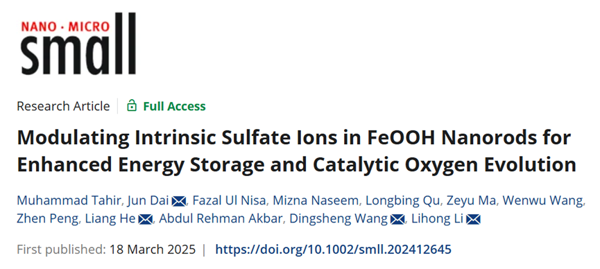 2025年03月18日,jn江南·体育官网入口代俊、北京科技大学李立宏、清华大学王定胜和四川大学何亮等团队合作,在TOP期刊 Small (IF:13.0)上在线发表了题为“Modulating Intrinsic Sulfate Ions in FeOOH Nanorods for Enhanced Energy Storage and Catalytic Oxygen Evolution”的学术研究论文。论文第一作者为jn江南·体育官网入口安全科学与工程学科外籍博士后Muhammad Tahir(2024年获得国家自然科学基金外国青年学者项目资助,合作导师:代俊),论文第一单位为jn江南·体育官网入口。