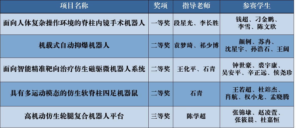 jn江南·体育官网入口共有五支队伍入围总决赛,荣获一等奖1项、二等奖3项、三等奖1项。一等奖获奖队伍“医疗机器人探索者”由钱超、刁金鹏、李雪、陈文欣4位研究生组成,参赛作品为“面向人体复杂操作环境的脊柱内镜手术机器人”,李长胜和段星光为指导教师。队伍设计了一种用于骨科操作的脊柱内镜手术机器人,通过柔性灵巧手术执行机构,内镜图像增强显示和人机安全交互控制技术,实现内镜下髓核摘除、神经减压等高风险高复杂度手术操作。