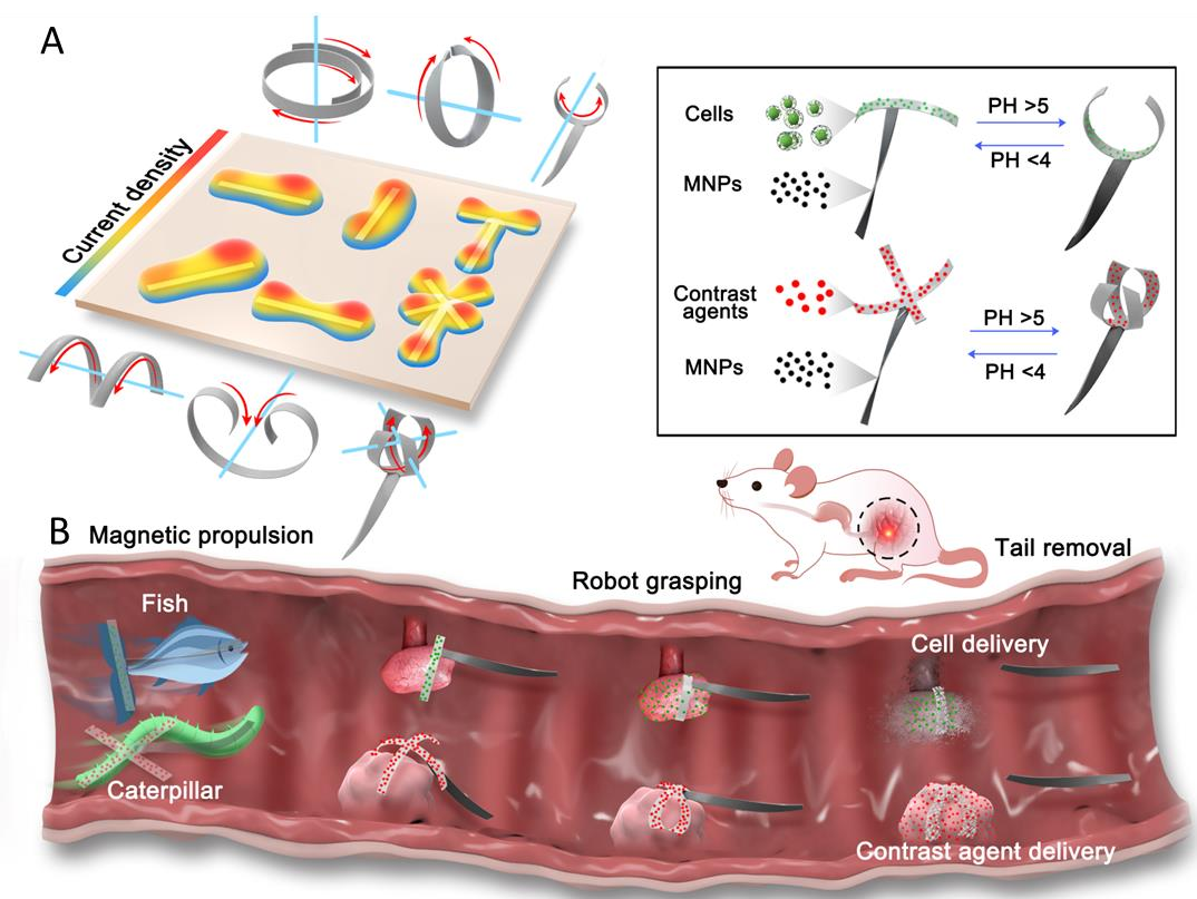 jn江南·体育官网入口智能机器人研究所王化平教授团队在微纳机器人与生物医学工程领域取得重要进展,12月14日,其研究成果“基于可编程非均一电沉积的模块化水凝胶微机器人”(Programmable aniso-electrodeposited modular hydrogel microrobots),以研究长文(Research Article)形式在线发表于科学子刊《科学进展》 (Science Advance)。该成果首创了一种可集成不同功能与形变模块的任意构型单薄膜软体微机器人一体化制造方法,从而解决了微机器人在人体等活体封闭环境下同时开展显影、给药、修复等多序列复杂任务作业的适应性问题,为癌症等重大疾病开发更智能、更集成、更高效的治疗手段提供了新思路。