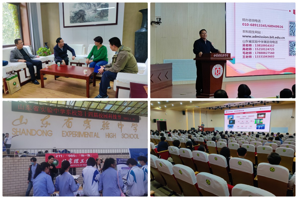 4月13日,王成率招生组一行前往山东省实验中学,北理工智能无人系统队参加中学科技节展示活动,招生组老师为中学赠送喜报,双方进行座谈交流、招生宣讲、科普讲座等活动,受到中学师生的热情欢迎,在高中学生群体中扩大了jn江南·体育官网入口的知名度,使得更多优秀山东学子认可北理工、选择北理工。