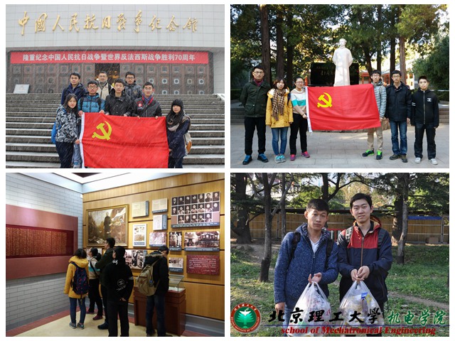 在理论学习的同时,各支部将开展了形式多样的参观活动与志愿服务,将实践与理论相结合,加强党员的理想信念教育。14S3党支部和2013级本科生第一党支部各自参观了中国人民抗日战争纪念馆,参观历史遗迹,体会那段峥嵘岁月,坚定了党员的信仰和实现“中国梦”的信念。2013级本科生第二党支部组织支部全体成员前往李大钊烈士陵园,祭奠和缅怀伟大的无产阶级革命斗士,参观了李大钊革命烈士陈列馆。活动增强了党员党性意识,坚定了思想,明确了为实现中国梦而奋斗的人生目标。15S2党支部组织支部全体成员前往香山景区清理垃圾,以实践的方式发挥党员的先锋模范作用。
