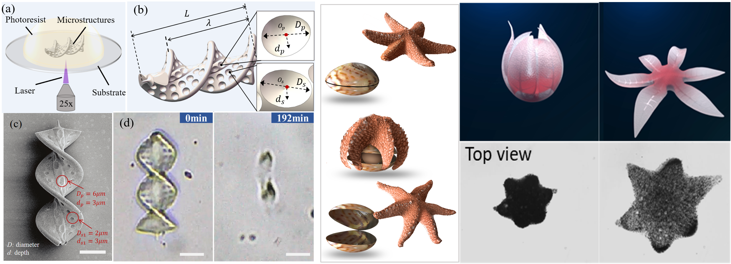 同时,作品设计了螺旋型和仿海星微机器人本体结构。螺旋微型机器人较硬的机械结构可用于血栓钻孔,海星机器人可用于溶栓药物靶向运输。微机器人在外部磁场的控制下,执行血栓清理任务,最终自主生物降解。