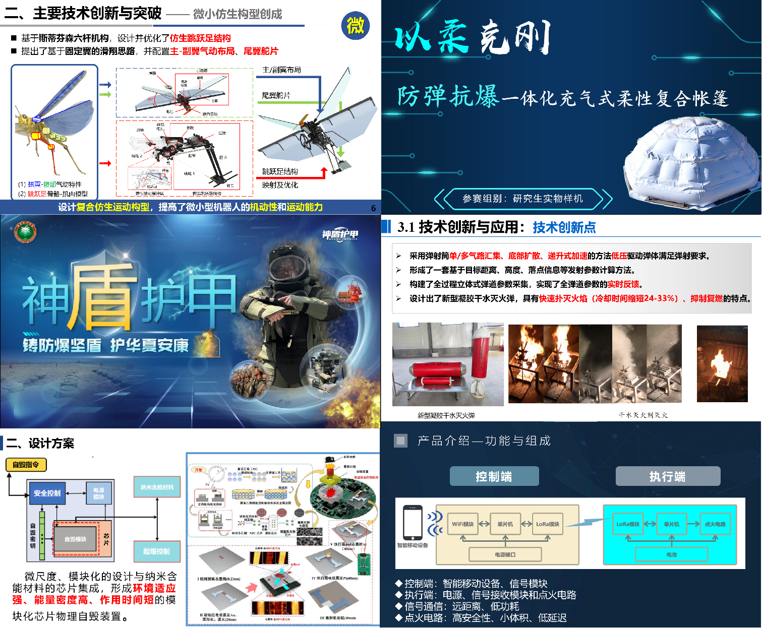 在经过激烈角逐后,jn江南·体育官网“跃蝗翔影——微小型陆空跨域仿蝗虫机器人”脱颖而出,取得研究生组唯一特等奖。该项目借鉴参考蝗虫的生物特性,研究爬行-跳跃-滑翔多模态机构的耦合设计方法与多模态协同控制方法,实现了微小型机器人复杂环境上高效率、高爆发的运动。爬行可实现稳定移动与姿态调整,跳跃具备瞬时的爆发能力,滑翔则可以扩展探测视野以及越过大型障碍,将三者相结合能实现稳定、高效的复杂环境运动。本机器人具有小巧的体积和高效率的运动模式,可用于监测需要机器人长期待命的复杂环境;且机器人隐蔽性好、运动效率高、待机时间长更能适应战场环境。