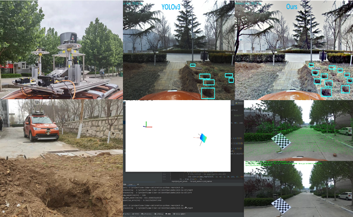 2022年2月以来,团队师生在西山实验区的无人车环境感知识别实验平台上开始赛事筹备。院校各级单位对比赛给予大力支持,无人车环境感知识别项目组及本科毕设同学积极参与,指导教师对参赛队员进行精心指导,现场指导帮助学生完善和优化参赛作品设计和实验验证,最终取得2022中国(国际)传感器创新创业大赛决赛三等奖的好成绩。参赛队员自选题开始投入大量精力,历时半年时间,完成方案论证、系统调试、代码编写、实验验证的全过程。中国(国际)传感器创新创业大赛对于培养和提升学生的动手能力、创新能力、综合实践能力起到了重要作用。无人车技术日益发展,其环境感知与理解是目前研究的重点和难点。野外非结构化道路低于地面的凹障碍快速识别是无人车安全行驶的前提和基础,且更难检测。本作品针对无人车凹障碍物检测的需求和面临的问题,使用多传感器融合+深度学习+图像增强的方式对常见的凹障碍进行检测,突破了多传感器标定、图像预处理及凹障碍检测定位等多项关键技术,为无人车环境感知及凹障碍快速检测提供新思路、新方法。本作品相关研究成果已获授权国防发明专利2项,发表SCI论文2篇,EI论文1篇。