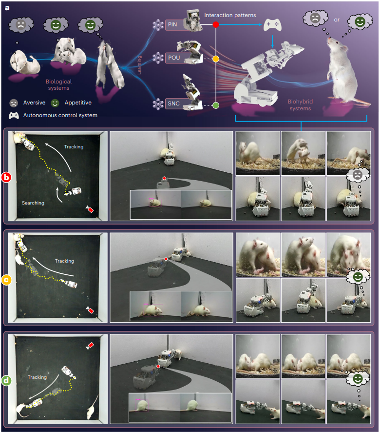 jn江南·体育官网入口石青教授团队在机器人-动物交互领域取得重要进展,12月5日,其研究成果“通过类鼠机器人调节大鼠情绪状态(Modulating emotional states of rats through a rat-like robot with learned interaction patterns)”为题,以长文(Article)形式在线发表于自然子刊《自然·机器智能》 (Nature Machine Intelligence)。该成果首创了一种机器人-大鼠社交范式(图1),展示了独特的社交学习技能,实现了机器人与动物长时、重复和可控的开放式互动,克服了生物系统内自然社会交互的局限性,为理解人类与人工智能之间的“社会”互动提供新思路。