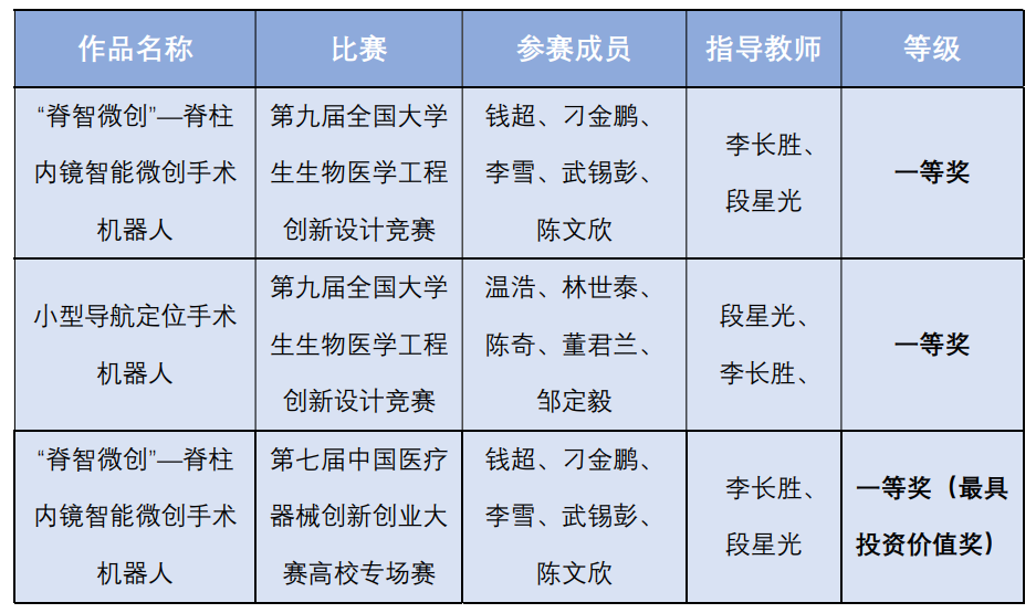 7月26日,由中国生物医学工程学会主办的第九届全国大学生生物医学工程创新设计竞赛在三亚市崖州湾科技城落下帷幕。jn江南·体育官网入口医疗机器人实验室“‘脊智微创’-脊柱内镜智能微创手术机器人”和“小型导航定位手术机器人”团队从全国250所高校近万名选手、3000多个项目参赛队伍脱颖而出,荣获两项一等奖(获奖比例4%)。其中“脊智微创”—脊柱内镜智能微创手术机器人项目还获得大赛配套活动第七届中国医疗器械创新创业大赛高校专场赛一等奖和最具投资价值奖。